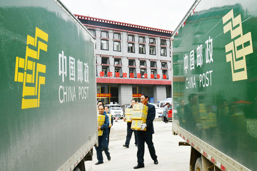 在香格里拉松茸交易市场,邮政工作人员将松茸邮件装车。一件件、一车车松茸通过邮政渠道走出雪域藏乡。
