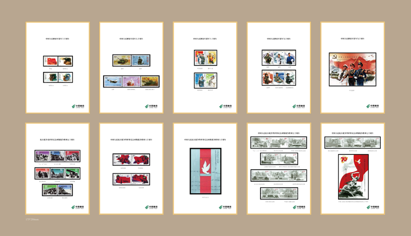 第四展柜展示的是人民军队题材邮票,包括三套抗战邮票和四套建军邮票。在这里我们看到的有2015年9月3日发行的《中国人民抗日战争暨世界反法西斯战争胜利七十周年》纪念邮票,全套13枚邮票和1枚小型张。