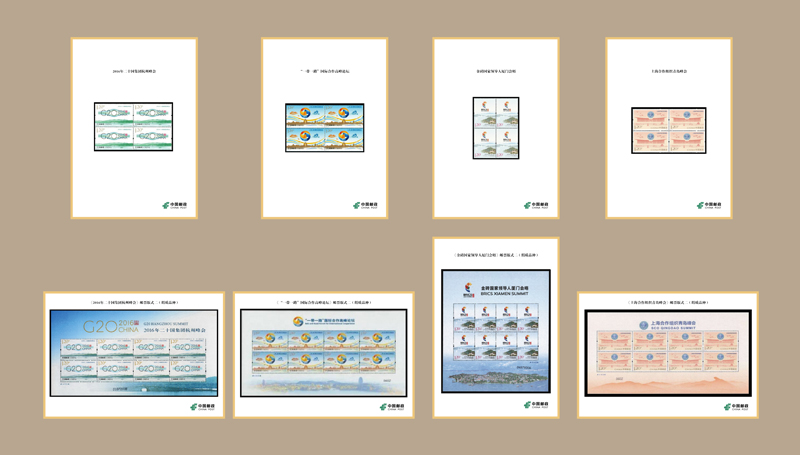 第九展柜展示的主题是“大国外交”,展现的是近年来我国主场重大外交活动,包括《二十国集团领导人杭州峰会》《“一带一路”国际合作高峰论坛》《金砖国家领导人厦门会晤》《上海合作组织青岛峰会》。这四套邮票同时发行了绢质版式。