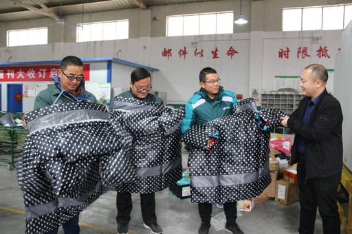 “这挡风被真厚实。”11月17日,河南省卫辉市邮政分公司“三合一”邮件处理场地的投递员们拿着新发放的棉帽子、棉手套、电动车挡风被等御寒保暖劳保用品感慨道。□刘艳玲  摄