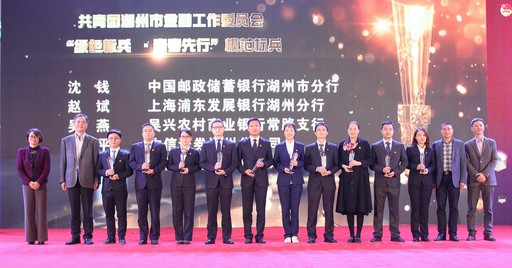 在浙江省湖州市金融系统近日举办的“建功新时代 金融青年说”演讲比赛上,共青团湖州市委对湖州市“绿色金融青年先行”十大模范标兵进行了表彰,邮储银行湖州市分行的沈钱(左六)获得此项荣誉。