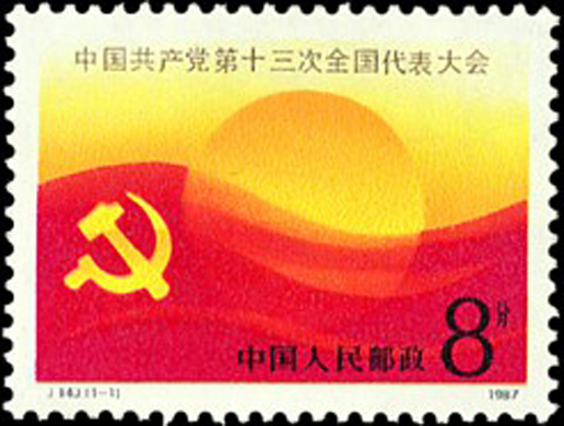 中国共产党第十三次全国代表大会于1987年10月25日至11月1日在北京召开。出席大会的正式代表1936人,特邀代表61人,代表当时全国4600万名党员。此外,全国人大常委会党外副委员长、全国政协党外副主席、各民主党派、全国工商联负责人和无党派爱国民主人士、少数民族和宗教界人士96人列席了大会,并有中外记者(其中包括1名中国台湾记者)400多名采访了大会。该套邮票由康人平设计,于1987年10月25日发行。