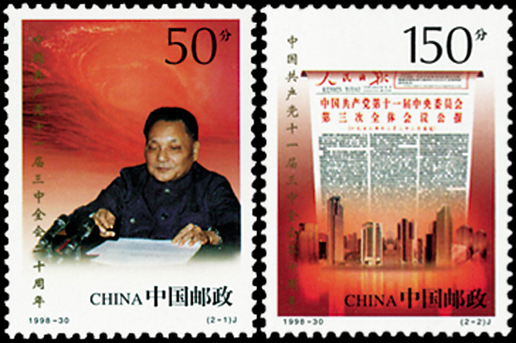 1978年12月18日至22日,中国共产党十一届三中全会在北京召开,共有中央委员169人,候补中央委员112人出席了大会。全会作出了把工作的重点转移到社会主义现代化建设上来的决策。为了纪念党的十一届三中全会召开20周年,1998年12月18日,国家邮政局发行了《中国共产党十一届三中全会二十周年》纪念邮票,全套2枚,由苏海一设计。
