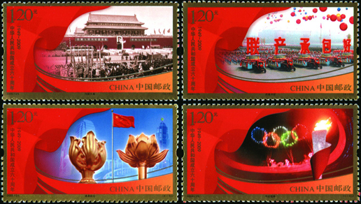 2009年10月1日是中华人民共和国成立60周年纪念日。60年来,全国各族人民在中国共产党的领导下,以一往无前的进取精神和波澜壮阔的创新实践,谱写了中华民族自强不息、顽强奋进的壮丽史诗。该套邮票由张艺谋、陈名杰设计,于2009年10月1日发行。