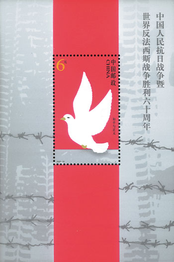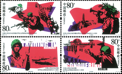 2005年8月15日,中国邮政发行《中国人民抗日战争暨世界反法西斯战争胜利六十周年》纪念邮票,一套4枚,小型张1枚,这也是第一枚抗战胜利小型张。邮票内容上第一次出现中国以外反法西斯的战场,第三枚为诺曼底登陆,第四枚为攻克柏林。小型张为和平与正义,主图是和平鸽,背景是战争中坦克的印记以及集中营的铁网。该套邮票由武将设计。