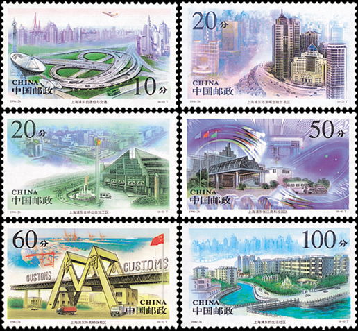 浦东紧靠上海市区,位于黄浦江东侧,长江口西南,川扬河以北。1990年国务院制订了开发浦东,把上海建设成国际航运中心,国际经济、金融、贸易中心之一的宏伟计划。如今浦东新区建设已取得了巨大成就。该套邮票由李斌、杨顺泰、张安朴设计,1996年9月21日发行。