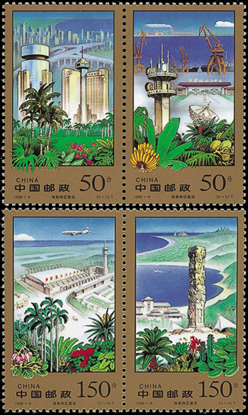 经济特区是在对外经济活动中,采取更为开放的政策,以吸引外国投资,繁荣本地区经济的一些城市与地区。这套邮票上的经济特区分别是深圳、珠海、汕头、厦门、海南。这些经济特区的设立为我国的改革开放闯开了一条新路。该套邮票由王振华、陈晓聪设计,于1994年12月10日发行。