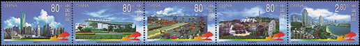 深圳位于我国南部地区,拥有海洋的地理优势,深圳是中国改革开放后设立的第一个经济特区,经过20年的努力,昔日的边陲小镇现已发展成为一个经济繁荣,社会全面进步的现代化国际大都市。邮票中可以看出现代化的高楼大厦,活动中心等建筑物,整个城市现代感十足,被誉为中国改革开放的窗口。该套邮票由于万新、张雪峰设计,于2000年8月26日发行。