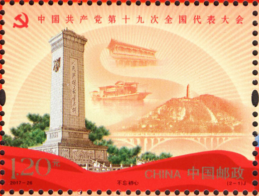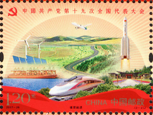 中国共产党第十九次全国代表大会于2017年10月18日至10月24日在北京召开。这次大会的主题是:不忘初心,牢记使命,高举中国特色社会主义伟大旗帜,决胜全面建成小康社会,夺取新时代中国特色社会主义伟大胜利,为实现中华民族伟大复兴的中国梦不懈奋斗。党的十九大,是在全面建成小康社会决胜阶段、中国特色社会主义发展关键时期召开的一次十分重要的大会。承担着谋划决胜全面建成小康社会、深入推进社会主义现代化建设的重大任务,事关党和国家事业继往开来,事关中国特色社会主义前途命运,事关最广大人民根本利益。为纪念中国共产党第十九次全国代表大会的召开,中国邮政发行纪念邮票一套2枚,小型张1枚。邮票图案内容分别为:不忘初心、继续前进,小型张内容为筑梦。该套邮票由马立航设计,于2017年10月18日发行。