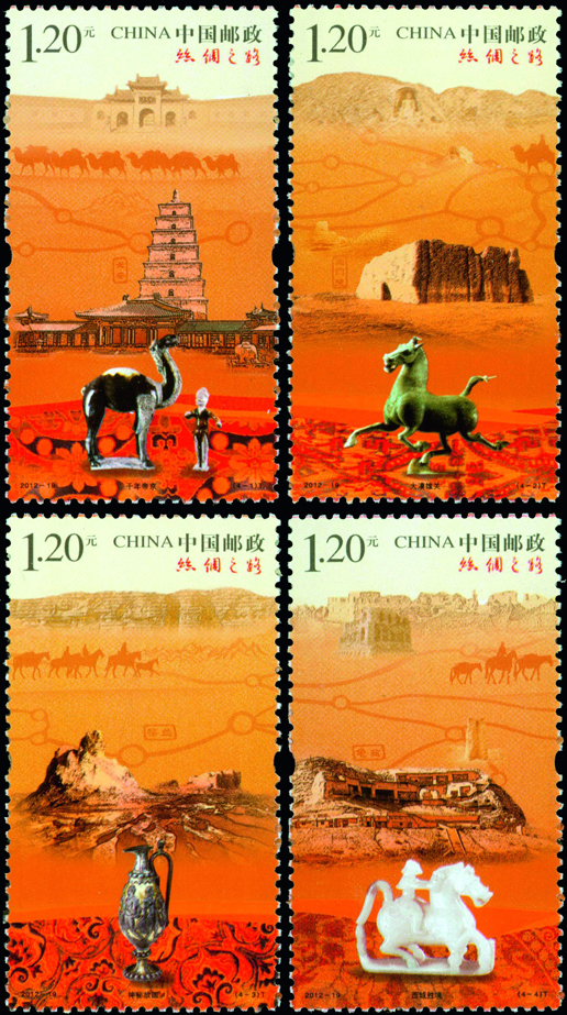 2012年8月1日,中国邮政发行《丝绸之路》特种邮票一套4枚,小型张1枚。邮票内容分别为千年帝京、大漠雄关、神秘故国、西域胜境,小型张内容为交流。该套邮票由陈景异、惠斌、李群设汁。