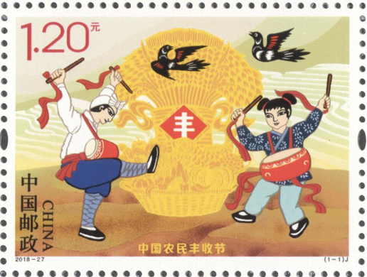 经党中央批准、国务院批复,自2018年起,将每年农历秋分设立为“中国农民丰收节”。第一届“中国农民丰收节”的日期为2018年9月23日(农历戊戌年八月十四)。中国邮政当天发行《中国农民丰收节》纪念邮票1套1枚,邮票表现了农民在金秋时节庆祝丰收的场景,表现了一幅全国上下“庆五谷丰登、享丰收喜悦”的美好画面。邮票设计者为沈嘉宏。