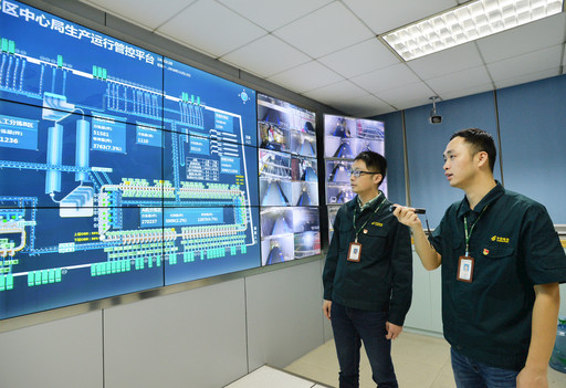 汪磊(右)与团队成员一起了解生产管控平台运行情况。