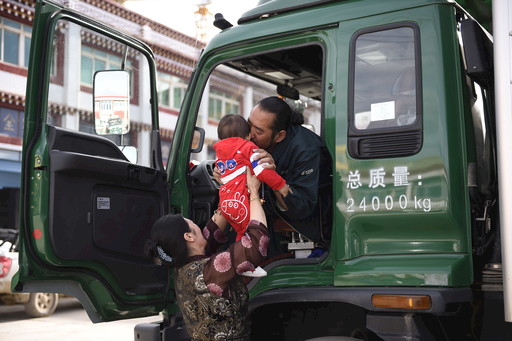 中国邮政甘孜县分公司邮运驾驶组组长其美多吉依旧驾驶着邮车,往返在甘孜县与德格县之间。这段路程是四川省甘孜州绵延5866公里、平均海拔超过3500米的雪线邮路最危险的一段。而其美多吉,是这条邮路上坚守了29年的“航标”。图为出发前,泽仁曲西将孙子举到丈夫其美多吉跟前,让祖孙俩告别。