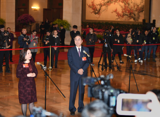 今年两会共举行四场“部长通道”集中采访活动,34位部长回答了66位记者和网友提出的89个问题,图为生态环境部部长李干杰(左)在部长通道上提出污染防治要聚焦打好七场战役。