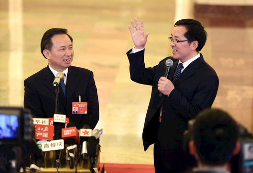 今年全国政协会议共举办了三次“委员通道”集体采访活动,图为全国政协委员刘月宁(左)、冯巩(右)在“委员通道”接受采访。