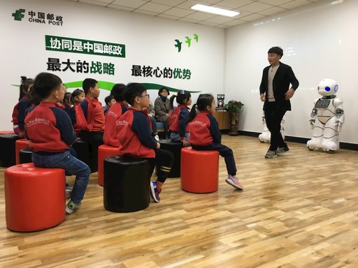 在丰南区分公司“邮爱家”智能科技体验馆开馆仪式上,工作人员向小朋友介绍机器人的功能。王琳  摄