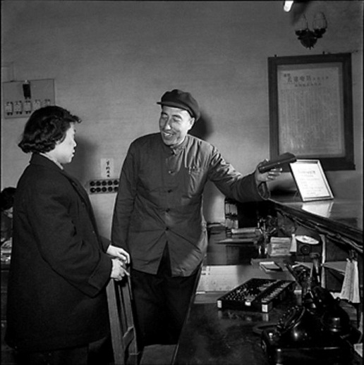 1958年4月,北京市邮局东城区局长兼党总支书记刘桂馨(右),在东四邮电局指导营业员工作。工人日报 杜治 摄