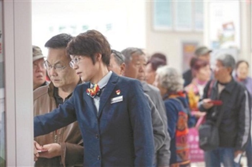 在自动存取款机前,排了十多位老人,樊洁先让在后面排队的老人到休息区的椅子上休息一下,再一个个帮助存取钱的老人办理业务。有的老人听不大清楚,她就凑近耳朵不厌其烦地一字一句地告诉他们,当天上午,樊洁在自动存取款机前站着忙活了两个多小时。“对我们营业厅的工作人员来说,要求来有迎声,问有答声,走有送声,唱收唱付声。只要用情用心服务,就没有办不成的事。”她说这是东四邮局的传统。