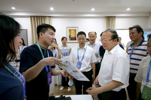 在世界邮展期间,武汉市副市长刘子清(前右)亲切慰问了会刊工作人员。刘子清称赞此次邮展宣传工作:做得非常好!