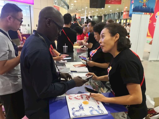 为了提升用户体验,展示邮政服务重大赛事的整体实力,北京体育邮局为本次赛事制作了特需邮品、明信片等6款产品,受到了广大球迷的追捧,成为赛场外的一大亮点。图为北京体育邮局工作人员为外国球迷提供邮品售卖服务。 □管军  薛寿源  摄影报道