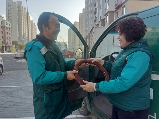 内蒙古自治区包头市邮政分公司东河区分公司惠民揽投部主任邢爱萍(右)为驾驶员闻杰(左)送上了特别准备的保暖方向盘套,为员工的冬季外出作业提供有效保护。□白新华 摄影报道
