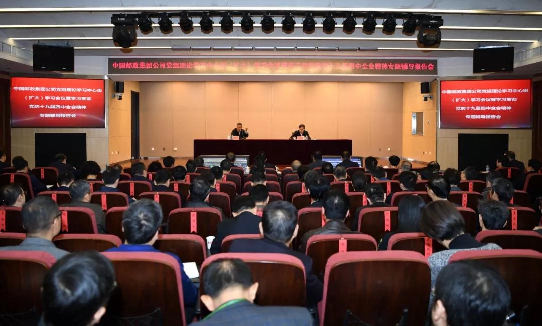 11月21日,中国邮政集团公司举办党组理论学习中心组(扩大)学习会议暨学习贯彻党的十九届四中全会精神专题辅导报告会,邀请中共中央党校教授、中央电视台特约时政评论员辛鸣解读党的十九届四中全会精神。中国邮政集团公司党组书记刘爱力主持会议。集团公司党组成员、总部机关三级副及以上人员和控股子公司、寄递事业部、在京直属各单位领导班子成员在主会场参加会议;集团公司各控股子公司、直属各单位和各省(区、市)、地市、县邮政三大板块四级副及以上党员干部在各分会场参加会议。