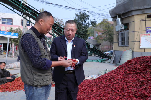 牛志勇(右)在农村走访调研,与辣椒收购大户交流,了解客户金融需求。