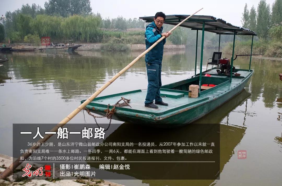 36岁的王少朋,是山东济宁微山县邮政分公司南阳支局的一名投递员,从2007年参加工作以来就一直负责南阳支局唯一一条水上邮路。一年四季,一周6天,都能在湖面上看到他驾驶着一艘绿色邮政船,为沿线7个村的3500多位村民投递报刊、文件、包裹。12年,他在这条水上邮路行驶了30多万公里。