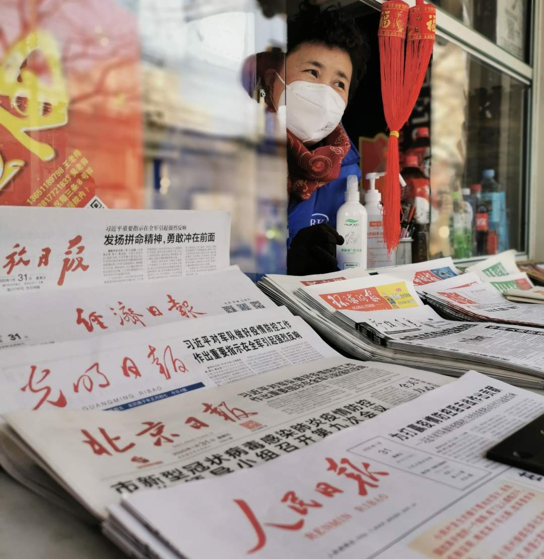 这个春节与往年不同,她开门第一件事儿,就是做好报刊亭的清洁消毒和自己的防护工作。她说,北京市报刊零售公司为我们配发了免洗消毒液和消毒剂,每天询问健康情况,叮嘱我们注意防护。9:30,一位老大姐过来买《北京日报》和《参考消息》;还有人来打听晚报和疫情情况;9:40,一个快递小哥儿习惯地把车停在报刊亭旁边,扫码4块钱买了《北京日报》《参考消息》《环球时报》,直说好几天没看报了。今年从除夕到初七,这个报刊亭销售报刊1599元,《人民日报》《北京日报》《参考消息》《北京晚报》累计销售近500份。大姐这些天虽然总是戴着口罩,可一见到老客户,眼角笑容立马荡漾出来,邮局配发的消毒液,她就摆在柜台前面,经常招呼顾客们消毒使用。问她怎么不关门休息几天啊?她笑笑说,“周边老人需要我啊,他们说报刊亭可不能再关了门了,每天就想着到报刊亭来溜达一圈呢”。