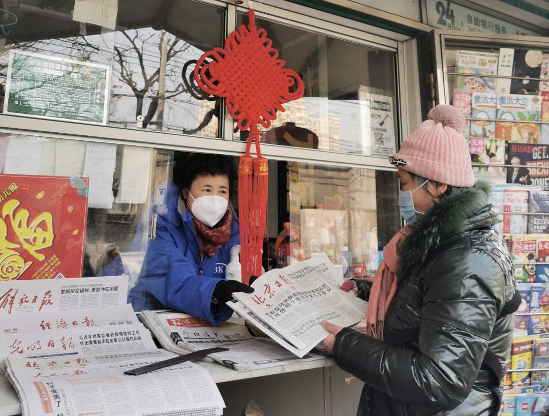 1月31日上午,大年初七。疫情之下,街上行人不多,丰台区东铁匠营街道宋庄路顺四条甲20号院1号楼北侧的73261号邮政报刊亭仍在坚守。经营人郑敏,55岁,自2016年以来,连续五年春节假期不关门不休息,热心为群众提供服务,买报的大爷大婶都亲切地叫她大姐,在报刊亭周边的几个社区里都小有名气。像是对面东城区政府宿舍的李大爷,旁边高法家属院的赵老先生,天天雷打不动都来光顾报刊亭,这已经成为他们生活中的乐趣。
