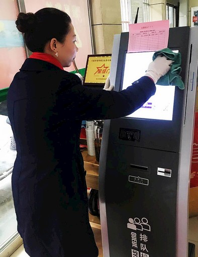 湖南省长沙市岳麓区邮政分公司日前组织员工对网点进行全面消毒,并在机具上粘贴“本日已消毒”告示。要求网点每日安排专人负责消毒工作,让邮政客户放心进入网点办理邮政业务。图为银盆岭邮政网点员工对叫号机进行消毒。□桂艺 摄影报道