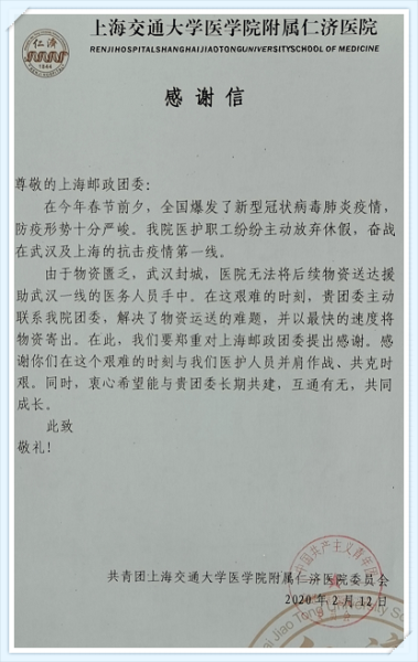 近日,上海邮政收到了仁济医院团委的一封“感谢信”。信中,对上海邮政团委表达了感谢之情。