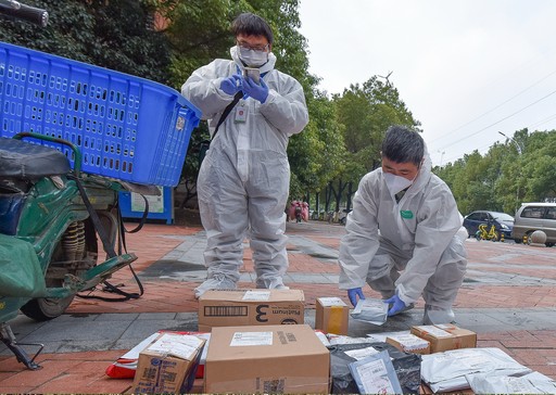 4月1日9点,湖北省武汉市江汉区远洋朗院小区门前,一名宅急送投递员将一件包裹交到湖北省邮政分公司帮扶社区的党员志愿者易继全手中后,就继续自己的投递工作了。接下来,易继全会联系收件人,约定领取时间和领取地点。
