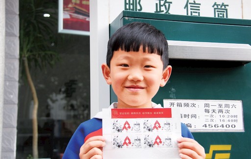 5月11日,河南省安阳市滑县红旗路邮政营业厅外,一位小邮迷成功购得心仪的《众志成城 抗击疫情》邮票,兴奋地展示起来。牟会锋  摄