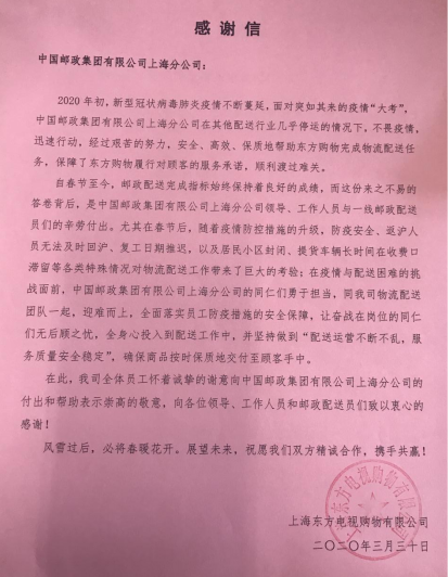 近日,上海邮政收到一封感谢信。信中诉说着同心抗“疫”的团结,字里行间充满着感激之情让广大上海邮政人收获了春天般的温暖。信中这样写道: