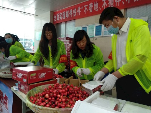 在天水市分公司邮件处理中心,一箱箱装好的樱桃在作业线上扫描、分拣、装车。天水市分公司副总经理蒋志强说:“当天收寄的樱桃要以最快的速度赶发晚上的航班,保证今天枝头的樱桃明天就能让客户品尝到。现在速度很快,做到次日递是没有问题的。”