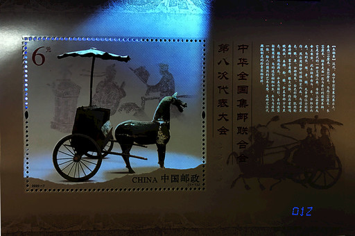 印制后的邮票,不仅在日光下色彩沉稳大气,文物木轺车和马匹历经岁月洗礼的沧桑尽显,精准还原轺车车型,引发观者对2000多年前邮运工具的无尽联想,而且在荧光灯照射下,更加出彩,只见票面上忽有一束光柱自上而下,洒在木轺车上,车身、马背在灯光笼罩下泛出光芒,车身、马身下阴影、光圈斑驳相映,背景的汉代古画忽然与车马拉开了距离,似一幅壁画静立其后,木轺车瞬间从平面变为立体,让观者仿佛置身于博物馆,在射灯光柱下观赏真实文物。