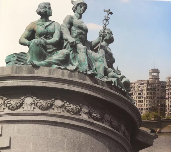 大楼的两边各有一组艺术雕像,一边三人分别拿着火车头、轮船和电信电缆模型,象征交通和通信;另一边也是三人,中间是希腊神话中的通信之神,左右则都是爱神,象征邮政为人间沟通情愫。