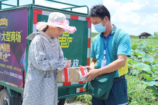 7月22日,是我国农历的大暑节气。近日,广西壮族自治区贵港市气温持续攀升,最高温度达37摄氏度。为了把邮件及时、快速、准确地送到群众手中,邮政员工在炎炎烈日下,电话不离手,腿脚不停歇,确保邮件安全送达。图为湛江镇邮政支局投递员到荷花田里送邮件。 □覃东新 摄影报道