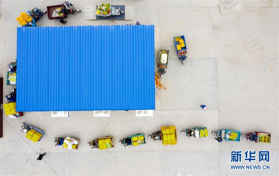 在宁夏红寺堡区柳泉乡柳泉村黄花菜晾晒场,村民排队称重黄花菜(7月11日摄,无人机照片)。 新华社记者 杨植森 摄