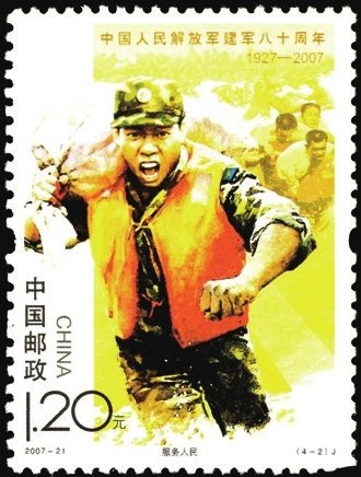 2007年8月1日发行2007-21《中国人民解放军建军八十周年》纪念邮票1套4枚,画面生动表现了中国人民解放军在党的领导下,发扬听党指挥、服务人民、英勇善战的优良传统,刻苦训练、抗洪抢险,参与联合国维和行动,用忠诚和热血捍卫国家主权和安全,筑起共和国的钢铁长城,集中反映出军队建设的新成就和我军忠实履行历史使命的时代风采。