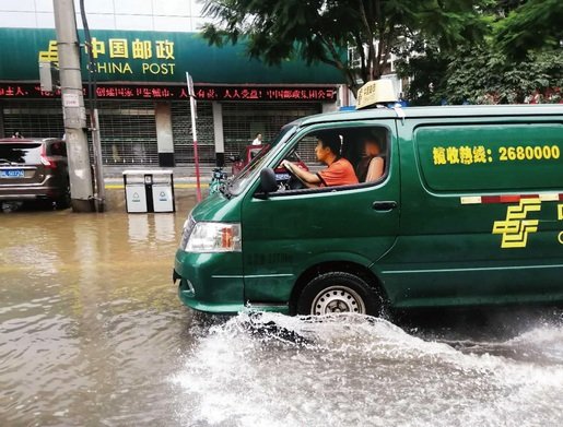 乐山邮政员工克服道路积水的影响,在保证安全的前提下出班投递。□王海涛 摄
