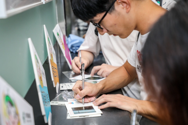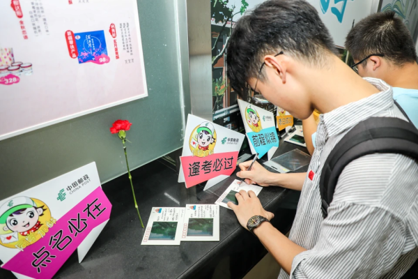 在邮政小哥哥小姐姐的引导和解说下,同学驻足,写下对辅导员、任课老师的教师节祝福。展位前挤满了前来写明信片的同学,将对恩师的感激与祝福在字句中纷纷呈上。
