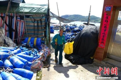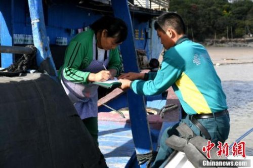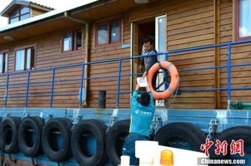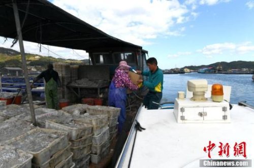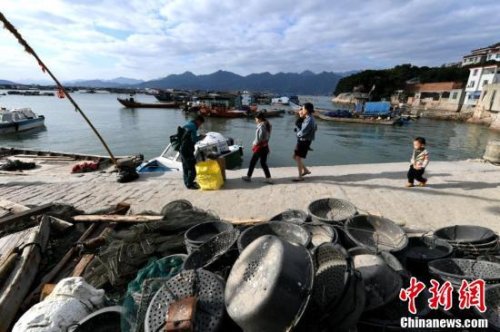 “双十一”刚过,福建省宁德市蕉城区海上邮递员石进全比往常更加忙碌。图为村民到码头领取包裹。