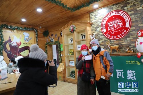 12月28日,游客举着明信片在北极村邮政支局合影。