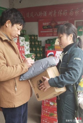 ▲肖冬莲(右)正在派送包裹。