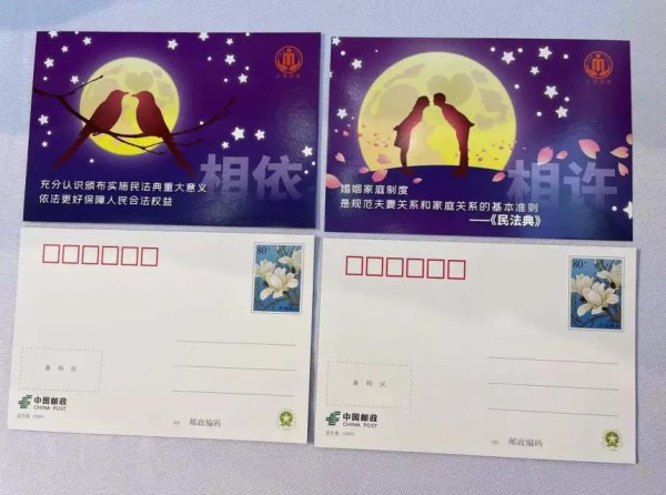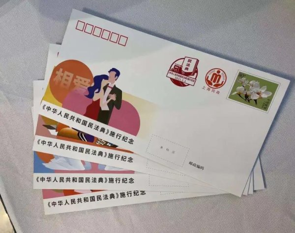 《中华人民共和国民法典》是新中国成立以来第一部以“法典”命名的法律,是新时代我国社会主义法治建设的重大成果。值此民法典施行之际,上海市邮政分公司特为上海市民政局定制了《<中华人民共和国民法典>施行纪念》邮资封一套四枚及邮资明信片一套四枚,邮资封片采用了上海市花白玉兰的邮资图。该套邮品以爱情为主线,分别以相遇、相许、相依、相伴、相恋、相爱、相思、相守为主题,配以《民法典》中原文的摘录,寄托着对爱情、婚姻的美好祝愿。
