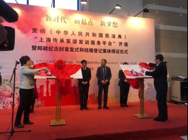 为贯彻《民法典》,传承中华优秀婚姻家庭文化,弘扬新时代婚姻法治精神,今天(2021年1月1日)上午10:00,上海市民政局、上海图书馆、中国邮政集团有限公司上海市分公司、徐汇区人民政府共同在上海图书馆会展区展览大厅举办“新时代、新起点、新梦想”——贯彻《中华人民共和国民法典》、“上海市传承家谱家训服务平台”开通暨邮政纪念封首发式和结婚登记集体颁证仪式。