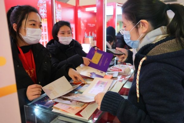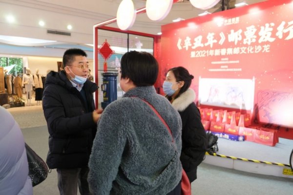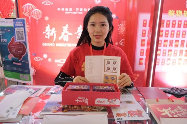 红色的新年背景和绿色的邮政元素交相辉映,吸引路人络绎不绝,或驻足观看,或悠哉合影,或对感兴趣的邮品询问一二。