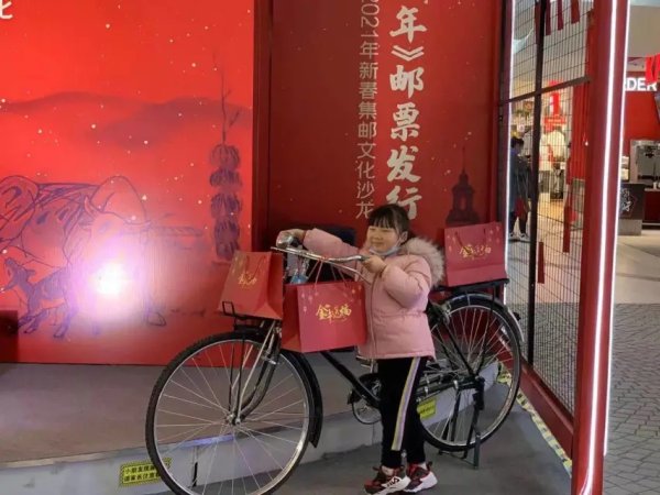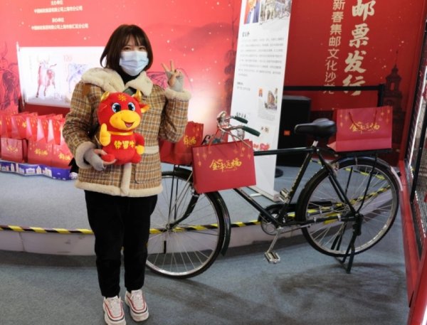 和男朋友一起逛街的小姐姐买到了心仪的邮品,还抽中了邮政生肖吉祥物“新年小牛”,心满意足地和自行车合影。